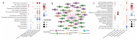 Notably, AC016831.6-205 (ENST00000604514.1) is the only lncRNA isoform that is upregulated in all metformin-treated cells. The second exon of this transcript can encode an anti-oncogenic peptide [31], as discussed above. This putative peptide, which might arise due to the circularization and translation of exon 2, has been characterized elsewhere [31] but not further explored. Functional enrichment analysis of all possible target genes of AC016831.6-205 was performed, ranking those potential targets by correlation value. We calculated a normalized enrichment score for known biological pathways enriched for the genes with transcripts positively or negatively correlated with AC016831.6-205 (Figure 5A). The resulting pathways corroborate the possible trans-action function of this RNA and the known effects of metformin (Figure 5A), such as the enrichment of HIF1A and HIF2A (hypoxia-induced factor 1A and 2A) pathways and hypoxia pathways. Hypoxia regulation is related to metformin-increased activity of the mitochondrial complex I [56,57]. Pathways associated with proliferation, such as adipogenesis (positive correlation) and metastasis (negative correlation), were also enriched among transcripts correlated with AC016831.6-205 (Figure 5A).