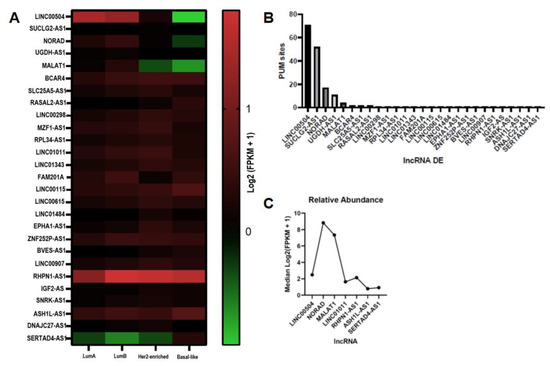LncRNA with sites for PUMILIO differentially expressed in BRCA. Legend: (A) Heatmap representation of the activity of expression networks of 27 lncRNAs in breast cancer molecular subtypes. According to this metric, differentially expressed positive (above the median—log2FC cutoff) (p < 0.05) are in red and differentially expressed negative (below the median—log2FC cutoff) (p < 0.05) are in green. Samples are arranged in the columns of the heatmap and categorized according to the annotation bar on the side of the graph (−0.92 to 1.8). The TCGA BRCA cohort samples were classified according to molecular classification into Lum A (n = 560), Lum B (n = 207), Her2-enriched (n = 82), and Basal-like (n = 190). (B) Number of sites for PUMILIO in 27 differentially expressed lncRNAs in breast cancer (BRCA). (C). Relative abundance of seven lncRNA with detectable expression—median Log2(FPKM + 1) (Fragments Per Kilobase Million) in BRCA samples from the same TCGA BRCA cohort.