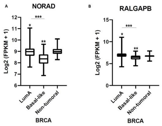 Differential expression of NORAD lncRNA and RALGAPB for Lum A and Basal-like subtypes. Legend: (A) Differential expression of NORAD lncRNA in comparing Lum A, Basal-like subtypes, and non-tumor samples. (NORAD) Lum A—Log2FC = 0.254, * p = 1.19 × 10−16, Basal-like—Log2FC = −0.2506, ** p = 4.66 × 10−4, Lum A versus Basal-like—Log2FC = 0.5048, *** p = 1.19 × 10−16. (B) Differential expression of RALGAPB in comparing Lum A, Basal-like subtypes, and non-tumor samples. (RALGAPB) Lum A—Log2FC = 0.3526, * p = 5.96 × 10−11, Basal-like—Log2FC = −0.1533, ** p = 1.542 × 10−2, Lum A versus Basal-like—Log2FC = 0.5059, *** p = 6.56 × 10−24.