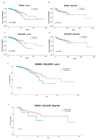 Overall survival analyses for Lum A and Basal-like patients related to lncRNA NORAD and RALGAPB expression. Legend: (A) Survival analysis considering the median value of NORAD in Lum A (High expression (n = 304), Low expression (n = 185)) and (B) Basal-like patients (High expression (n = 37), Low expression (n = 131)). (C) Survival analysis considering the median value of RALGAPB in Lum A (High expression (n = 282), Low expression (n = 207)), and (D) Basal-like patients (High expression (n = 38), Low expression (n = 130)). (E) Survival combined panel analysis with NORAD and RALGAPB in Lum A patients. (F) Survival combined panel analysis with NORAD and RALGAPB in Basal-like patients. Red and blue lines refer to patients with low and high expression, respectively. A p-value < 0.05 was considered significant.