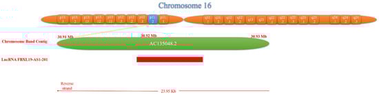 The FBXL19-AS1 (gene ID number NONHSAG019125.3 NONCODE databases) is only one transcript of 7385 nt in length and is located on the human chromosomal region 16.p11.2 chr16:30915910-30923295 (http://grch37.ensembl.org/Homo_sapiens/Gene/Summary?db=core;g=ENSG00000260852;r=16:30930640-30934590;t=ENST00000563777, accessed on 30 October 2022) (Figure 2). According to the lncLocator database (http://www.csbio.sjtu.edu.cn/bioinf/lncLocator2/, accessed on 26 January 2021), FBXL19-AS1 is located in the nucleus and cytoplasm (Table 2).
