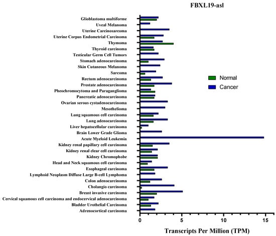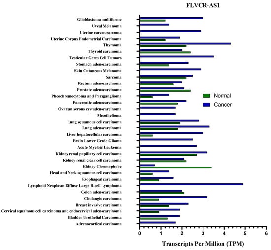 According to the last updated (September 2021) information by the Lnc2Cancer version 3 database (http://www.bio-bigdata.com/lnc2cancer, accessed on 30 September 2021), mean expression of FLVCR1-AS1 and FBXL19-AS1 in cancer and normal tissue is shown in Figure 3 and Figure 4.