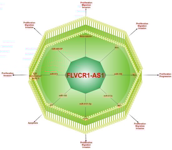 Furthermore, Zhang et al. (2018) revealed that highly expressed FLVCR1-AS1 in HCC could decrease miR-513c expression while increasing MET expression, thus suggesting that FLVCR1-AS1 promotes tumorigenesis through modulating MET []. In the study of gastric cancer, it was suggested that FLVCR1-AS1 regulates c-Myc expression through miRNA sponging []. The c-Myc is a significant miR-155 target gene and is a known proto-oncogene since its high expression is associated with cell proliferation, cancer development, and poor prognosis. Thus, an FLVCR1-AS1-miR-155-c-Myc signaling axis has been identified in gastric cancer. Moreover, the silencing effect of FLVCR1-AS1 on high expression of p21 stops cell growth and improves cell apoptosis []. The E2 factor (E2F) family of transcription factors are downstream effectors of the cyclin-dependent kinase (CDK)–RB–E2F. It has been described as an oncogene in many cancers []. E2F- transcription factor 2 in glioma and E2F-transcription factor 3 in lung cancer are related to the high proliferation and invasion by the role of the molecular sponge of FLVCR1-AS1 for miR-4731-5p and miR-57, respectively [,]. In ovarian cancer, the high expression of YAP1 observed confirmed that miR-513 directly binds to YAP1 and that miR-513 has an inverse relationship with FLVCR1-AS1 [].