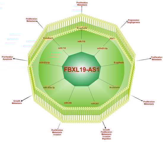 Many studies have revealed that FBXL19-AS1 can regulate the expression of specific miRNAs that play an oncogenic role in various cancers. FBXL19-AS1 causes cancers by acting in different signaling pathways (Figure 6; Table 4) [,,,,,,,,,,,,,,,,,,].