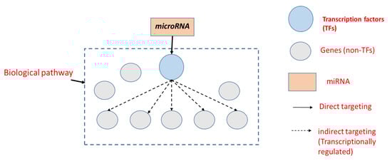 In order to computationally predict miRNA-targeted pathways, typically potential target genes are compiled using one or more miRNA target prediction tools and a standard gene enrichment analysis [4] is used to find potential enriched pathways or gene ontology (GO) terms. Although the conventional pipeline is widely used, it has some limitations. Of these, existing tools consider only direct targets (post-transcriptionally regulated) of miRNAs but do not consider indirect targets (mainly transcriptionally regulated) that are not necessarily enriched in miRNA seed-binding sites [5].