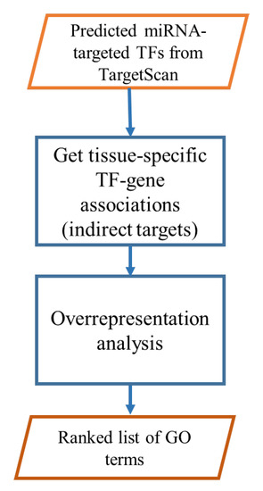 Our pipeline to predict indirectly targeted biological processes by miRNAs consists of three steps as depicted in Figure 2. First, for each miRNA, potential directly-targeted TFs were compiled from the TargetScan database v7.2 [26]. Second, computationally predicted tissue-specific TF-gene associations were collected from the resources website of (Sonawane et al., 2017) [27]. In the case of multiple input miRNAs, we use the intersection of indirect targets of each miRNA. Third, a hypergeometric test is conducted to find potential targeted biological processes.