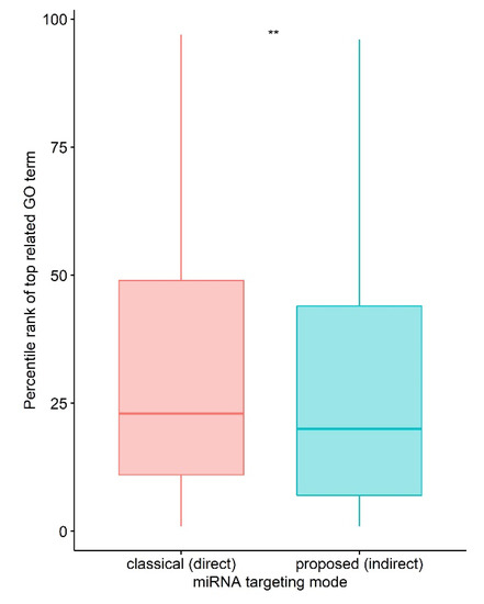 To test the ability of our methodology to predict functions associated with a miRNA, we used a dataset with 335 known miRNA-GO term pairs. All TargetScan-predicted targets were included in this analysis. For each miRNA-GO term pair, resulting GO terms were ranked by the hypergeometric test p-value in ascending order, then rank values were converted to a percentile rank by dividing by the total number of GO terms. Finally, we picked the related GO term with the smallest p-value (smallest rank value). Known GO terms predicted by the indirect targeting method have a significantly lower (Wilcox signed-rank test, one-sided p-value = 0.002417) rank compared to canonical direct targeting as shown in Figure 3.