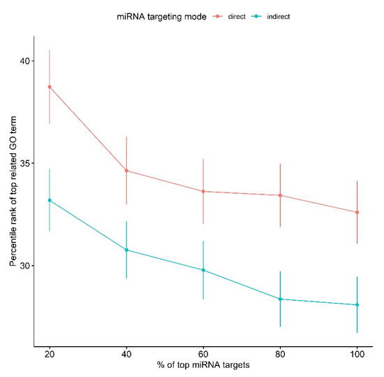 Since miRNA GO enrichment analysis is affected by targets of the miRNA and TargetScan-predicted targets can have false positives, we investigated the effect of the number of predicted miRNA targets on predicting the known GO terms. We repeated the same analysis but instead of using all predicted targets, we used the top (20%, 40%, 60%, 80% and 100%) of potential targets (sorted by TargetScan context++ score [26]). Figure 4 shows that in all cases, the average percentile rank of GO terms predicted by the indirect targeting methodology is lower than those predicted by direct targeting. Although increasing the number of miRNA targets yielded a lower average rank (better performance), using all of the targets did not give significantly better results compared to using the top 80% of targets and 40% of targets in the case of indirect and direct targeting, respectively.