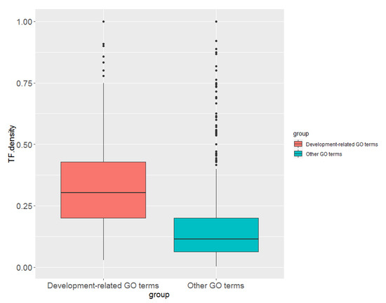 To see if transcription factors are enriched in development-related GO terms compared to other terms, we divided the GO terms (that have at least one TF) into two groups; one with development-related terms and the second with other terms or processes. We selected development-related terms by searching for GO biological process terms with the following keywords (“development”, “cell fate”, “differentiation”, “stem cell”, “morphogenesis”, “cell specification”, “formation”). Figure 5 shows that development-related terms (n = 613) tend to have significantly (p-value < 2.2 × 10−16, Wilcoxon rank sum test) higher TF density compared to other terms (n = 1767).