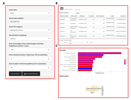 User interface of miRinGO R shiny application. (A) input parameters; (B) Table with miRNA GO enrichment analysis; (C) Bar plot and word cloud summarizing the top enriched GO terms.