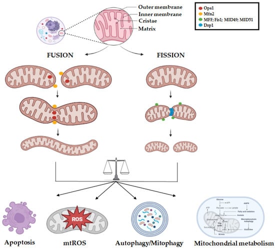 Figure 1. Mitochondrial dynamics machinery. Representative illustration of the mitochondrial fission and fusion events regulated by the main GTPase effector proteins. The fusion of outer mitochondrial membrane is regulated by Mfn1 and Mfn2, whereas the mitochondrial inner membrane fusion, mitochondrial cristae integrity, and remodeling are regulated by Opa1. Drp1 regulates mitochondrial fragmentation by its interaction with the fission receptors MFF, Fis1, MID49, and MID51. A fine balance of fission/fusion processes controls apoptosis, mitochondrial ROS (mtROS) production, autophagy, mitophagy, and mitochondrial metabolic pathways. The picture was created using BioRender software.