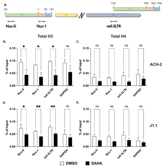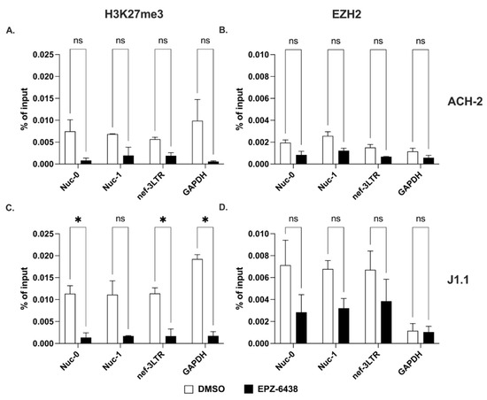 Trimethylation of lysine 27 on histone H3 at the 5′ and 3′ LTRs. (A,C) Detection of H3K27me3 at Nuc-0, Nuc-1, and 3′ LTR (nef-3LTR) in untreated and EPZ-6438-treated (open and black bars, respectively) ACH-2 and J1.1 cells (top and bottom panels, respectively). (B,D) Presence of histone methyltransferase, EZH2 at Nuc-0, Nuc-1, and 3′ LTR (nef-3LTR) in DMSO- and SAHA-treated (open and black bars, respectively) ACH-2 and J1.1 cells (top and bottom panels, respectively). Data show average and standard deviation (SD) of 2–4 independent experiments. To determine statistically significant differences, data were analyzed with Student’s t-test (unpaired, non-parametric). *, p < 0.05; ns, not significant.