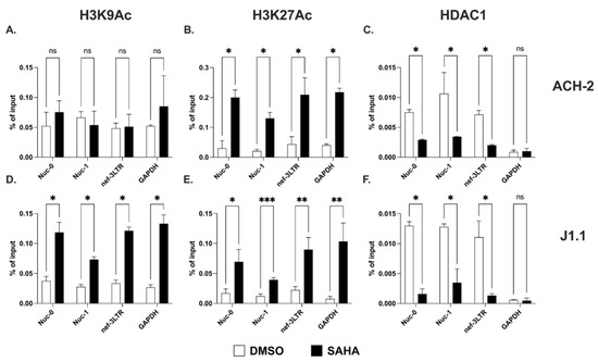 Acetylation of lysine 9 and 27 on histone H3 at the HIV-1 3′ LTR. Detection of histone H3 acetylated at lysine 9 (H3K9Ac; (A,D)) and lysine 27 (H3K27Ac; (B,E)) at Nuc-0, Nuc-1, and 3′ LTR (nef-3LTR) in untreated and SAHA-treated (open and black bars, respectively) ACH-2 and J1.1 cells (top and bottom panels, respectively). Presence of histone deacetylase 1 (HDAC1) at Nuc-0, Nuc-1, and 3′ LTR (nef-3LTR) in DMSO- and SAHA-treated (open and black bars, respectively) ACH-2 and J1.1 cells ((C) and (F), respectively). Data show average and standard deviation (SD) of 2–4 independent experiments. To determine statistically significant differences, data were analyzed with Student’s t-test (unpaired, non-parametric). *, p < 0.05; **, p < 0.005; ***, p < 0.0005; ns, not significant.