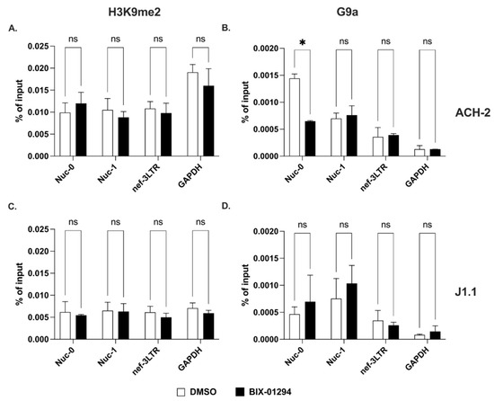 Dimethylation of lysine 9 on histone H3 at the 5′ and 3′ LTRs. (A,C) Detection of H3K9me2 at Nuc-0, Nuc-1, and 3′ LTR (nef-3LTR) in untreated and BIX-01294-treated (open and black bars, respectively) ACH-2 and J1.1 cells (top and bottom panels, respectively). (B,D) Presence of histone methyltransferase, G9a at Nuc-0, Nuc-1, and 3′ LTR (nef-3LTR) in DMSO- and SAHA-treated (open and black bars, respectively) ACH-2 and J1.1 cells (top and bottom panels, respectively). Data show average and standard deviation (SD) of 2–4 independent experiments. To determine statistically significant differences, data were analyzed with Student’s t-test (unpaired, non-parametric). *, p < 0.05; ns, not significant.