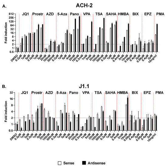 For these studies, we tested 11 different drugs belonging to 7 different classes of LRAs: the HDAC inhibitors Panobinostat, Valproic Acid (VPA), Trichostatin A (TCA), and SAHA; the BET inhibitor, JQ1; the canonical NF-κB pathway agonist, Prostratin; the non-canonical NF-κB pathway agonist or SMAC mimetic, AZD5582; the P-TEFb agonist, HMBA; the DNA methyltransferase inhibitor, 5-azacytidine; and the HKMTi, BIX-01294 and EPZ-6438. Each compound was tested at three different concentrations. ACH-2 and J1.1 were cultured with these compounds for 24 h (except for the two HKMTi, which were tested over 3 days). As negative and positive controls, we used cells treated with vehicle (DMSO) and PMA, respectively. At the end of the treatment, cells were harvested, and induction of sense and antisense transcripts in response to treatment with the various compounds was assessed by RT-qPCR. We found that in the ACH-2 model, all compounds induced antisense transcription to an extent similar or often greater than sense transcription (Figure 7A). In particular, at the highest concentration tested, all four HDAC inhibitors induced antisense transcription to levels significantly higher than sense transcription. In the J1.1 model, several LRAs increased sense transcription more efficiently than antisense transcription (Figure 7B). However, none of the 11 compounds tested here were able to increase sense but not antisense transcription in either cell system.
