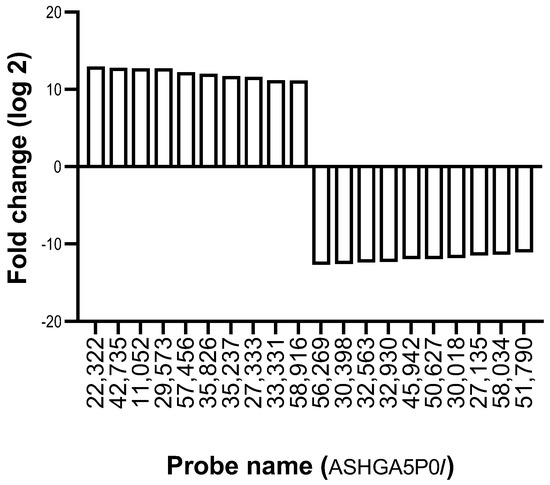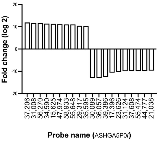 The lncRNA expression profile of ZZ monocytes isolated 48 h post-AAT augmentation therapy (herein referred to as ”Day 2”) was also measured by array and compared to ZZ monocytes from untreated individuals (Day 0). Figure 1 and Table 1 show the top 10 lncRNA increases and decreases in response to augmentation therapy. In total, 7509 lncRNA probes were found to have a fold-change ≥2.0 (equal to a log2 FC of 1.0)-altered expression in ZZ monocytes post-augmentation therapy versus Day 0; 3084 were increased and 4425 were decreased (Figure 2A, Heat map provided as Supplementary Figure S1A). ENST00000430815 was upregulated to the greatest extent, with a log2 FC of 11.9, while ENST00000559861 was downregulated to the greatest extent, with a log2 FC of −12.9.