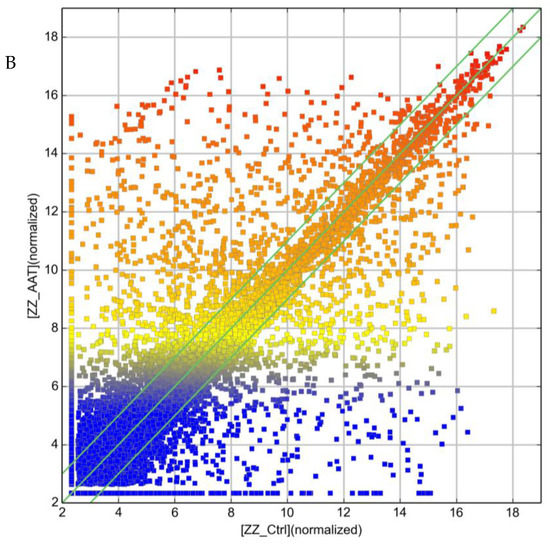 Scatter plots of lncRNA expression variation between (A) ZZ monocytes isolated 48 h post-AAT augmentation therapy (Day 2, Y axis) array and ZZ monocytes from untreated individuals (Day 0, X axis), and (B) ZZ monocytes treated ex vivo with 27.5 μM AAT for 4 h (ZZ_AAT, Y axis) and untreated control ZZ monocytes (ZZ_Ctrl, X axis). The outer green lines represent ±2.0 fold difference between the two compared samples.