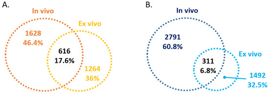 Venn diagram of in vivo and ex vivo differentially expressed lncRNAs. (A) Upregulated and (B) downregulated lncRNAs in ZZ monocytes isolated 48 h post-AAT augmentation therapy (In vivo) and ZZ monocytes treated ex vivo with 27.5 μM AAT for 4 h (Ex vivo).