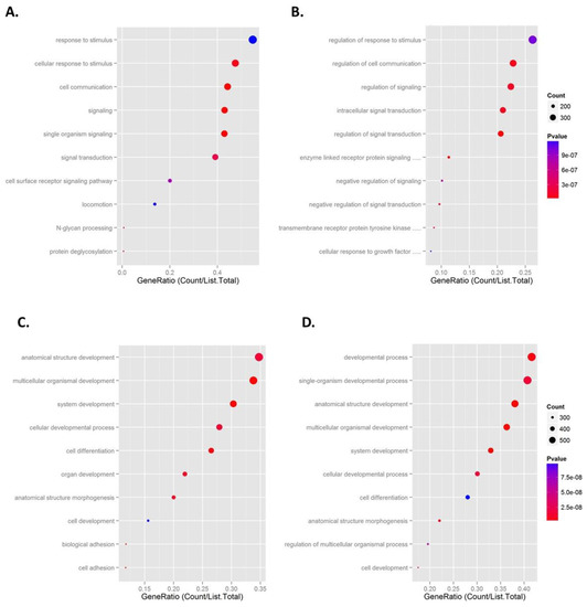 As previously reported, 334 genes were commonly downregulated by AAT [11]. There were 567 genes upregulated in the Day 2 versus Day 0 samples and in the ZZ monocytes treated with AAT versus those untreated. Pathway analysis of these differentially expressed regulated mRNAs was performed. Figure 5 shows dot plots of the gene ratio value of the top ten most significant enrichment pathways for the upregulated (Figure 5A,B) and downregulated (Figure 5C,D) mRNAs in the in vivo and ex vivo samples. For the upregulated mRNAs, there was little overlap between the enrichment pathways in both sets of samples. However, as previously reported, for the downregulated genes, seven of the top ten enrichment pathways in the ZZ monocytes receiving AAT augmentation therapy were also represented in the top ten pathways in ZZ monocytes treated with 27 μM AAT for 4 h [11]. These pathways are specifically related to developmental and morphogenesis processes and cell development and differentiation.