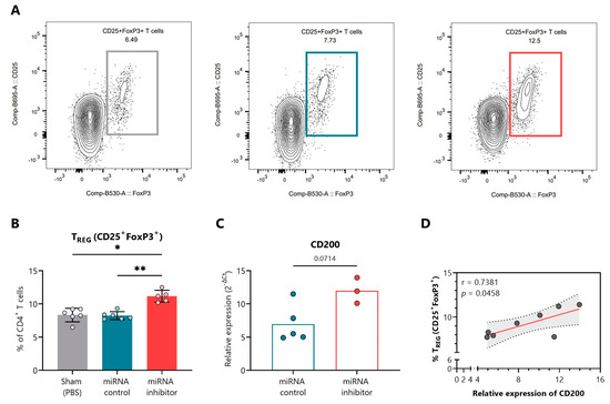 In vivo miR-30d-5p inhibition promotes Treg expansion by upregulating CD200 in pancreatic lymph nodes. (A) Representative FACS plots indicating the percentage of CD4+CD25+FoxP3+ Tregs in the PLN of the sham (left, grey), control inhibitor (middle, blue), and miRNA inhibitor (right, red) treatment groups. (B) Percentage of total CD4+CD25+FoxP3+ Tregs in the PLN of sham mice (n = 6, left, grey), mice treated with a control inhibitor (n = 6, middle, blue), or mice treated with the miR-30d-5p inhibitor (n = 5, right, red). Data are presented as mean ± SD. * p ≤ 0.05, ** p ≤ 0.01, Kruskal–Wallis with Dunn’s post hoc test. (C) Levels of CD200 mRNA (a validated target of miR-30d-5p) on the remaining PLN cells of mice treated with a control inhibitor (n = 5, left, blue) or the miR-30d-5p inhibitor (n = 3, right, red). Gene expression signal was normalized to GAPDH expression. Values are expressed as 2−∆Ct. Data are presented as mean ± SD. p-value was derived by the Mann–Whitney test. (D) Correlation between levels of CD200 mRNA and the percentage of total Tregs (CD4+CD25+FoxP3+). A significant positive correlation was found between both parameters (Spearman’s r = 0.7381, p = 0.0458, Spearman’s correlation analysis).