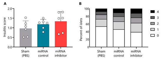 The insulitis score was determined at the end of the short treatment. As expected, mice in the sham group showed a similar insulitis degree (0.96 ± 0.39, mean ± SD) as the miRNA control group (1.182 ± 0.25) (Figure 9A). Mice treated with the miR-30d-5p inhibitor showed a biological trend toward an increased insulitis score (1.33 ± 0.51) in comparison to both control groups (Figure 9A); 37.3% of their islets were infiltrated or destroyed (scores from two to four), whereas only 27.3% and 33.5% of the islets were destroyed in the sham and the miRNA control groups, respectively (Figure 9B).