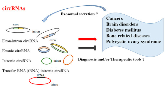 According to their splicing sequence, circRNAs can be categorized into several groups. Exon–intron circRNAs and intronic circRNAs are mainly located in the nucleus, suggesting that they may be involved in gene expression [13]. Exonic circRNAs are the most abundant circRNAs found in the cytoplasm [14]. A lariat structure may be formed by the covalent binding of the splice donor of the downstream exon of the precursor mRNA and the splice acceptor of the upstream exon, leading to the formation of exon–intron circRNAs and exonic circRNAs. In this model, further back-splicing by the covalent joining of the 3′ and 5′ ends might result in an intronic circRNA lariat. In some cases, exon skipping might also result in mixed circRNA lariats [15]. Circularization might be created from the introns flanking the exons of the pre-mRNA sequence. In addition, it has been reported that the biogenesis of circRNAs could be regulated by RNA-binding proteins (RBPs) [16]. A circular structure could be created by the connection of RBPs to introns on both flanking exons of the pre-mRNA sequence. RBPs could recognize the specific motifs of the back-splicing to form circRNAs. CircRNA may be localized in the nucleus, where it can recruit several proteins to modify the chromatin structure and/or to bind to DNA forming an RNA–DNA hybrid for the transcriptional alterations [17]. In the cytoplasm, circRNAs have also been detected; regulating target mRNA expression by acting as miRNA sponges [18]. CircRNAs are broadly present in tissues, blood, and urine with structural stability [19]. Similar to the ncRNAs, circRNAs could be encumbered into exosome vesicles to facilitate cell–cell communication [20].