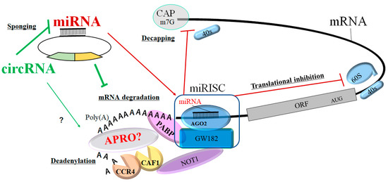 Schematic representation of circRNA- and/or miRNA-mediated functional inhibition of mRNA translation. The AGO2 protein interacts with GW182 constructing the miRNA-loaded RNA-induced silencing complex (miRISC), which may facilitate the deadenylation and/or mRNA degradation process by CAF1/CCR4/NOT1 with the PABP and APRO protein complex. Consequently, the circRNA and/or miRNA could play an active role in regulating post-transcriptional gene expression via the decapping, translational inhibition, deadenylation, and degradation of mRNA. The CAF1/CCR4/NOT1 complex is recruited to the 3′ UTR of specific mRNAs through an interaction with the PABP protein. APRO family proteins might also interact with PABP to recruit the CAF1/CCR4/NOT1 complex. The arrowhead means stimulation, and the hammerhead represents inhibition. Note that some critical pathways have been omitted for clarity. Abbreviations: ORF, open reading frame; miRISC, microRNA-induced silencing complex, “?” means for our speculation.