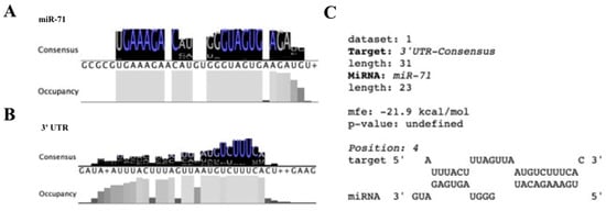 miR-71 and target 3′ UTR sequence conservation amongst multiple species. (A) A consensus sequence was created from the Clustal Omega alignment of 112 miR-71 sequences compiled after primary screening. Letters in blue indicate over 95% identity across sequences. (B) A consensus sequence was created from Clustal Omega alignment of 14 target 3′ UTR sequences after secondary screening. Letters in blue indicate over 95% identity across sequences. (C) Consensus sequences from (A,B) were aligned for miRNA-UTR binding showing an 8-mer A1 seed site the strongest binding capacity. Binding was favorable with a maximum free energy of −21.9 kcal/mol between the consensus miR-71 sequence and the consequence 3′ UTR sequence.