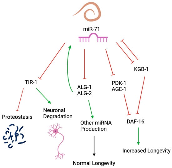 Consistent with its function on longevity miR-71 has also been found to function on organismal response to various forms of environmental stresses. Dietary restriction is a conserved pro-longevity intervention that extends lifespan across species. In C. elegans dietary restriction has been shown to upregulate miR-71 leading to the repression of transcription factor PHA-4 []. In turn the downregulating expression of PHA-4 by miR-71 leads to an extended lifespan in C. elegans likely due to the increased expression of DAF-16 and its target genes []. Additionally it has been shown that food odor can serve as a catalyst for the targeting of tir-1 by miR-71 in C. elegans []. The olfaction-dependent targeting of tir-1 by miR-71 promotes downstream effects such as proteostasis and longevity in these worms [].