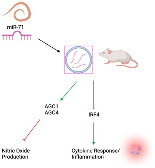 Mammalian targets of miR-71. miR-71 is believed to play a role in the pathogenicity of parasitic invertebrates. Parasitic invertebrates excrete extracellular vesicles that have been shown to contain miR-71 and may influence the pathogenicity of parasites. miR-71 has been shown to upregulate Argonaute proteins which ultimately leads to a decrease in nitric oxide production by macrophages. In a separate pathway miR-71 has been shown to negatively regulate IRF4 and suppress the immune response in mammals by decreasing cytokine response and inflammation.