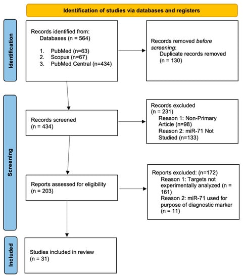 Preferred Reporting Items for Systematic Reviews and Meta-Analyses (PRISMA). A systematic search was performed using PubMed Scopus and PubMed Central databases to identify studies that experimentally investigate the targets of miR-71. The search terms used were “microRNA-71” “miR-71” and “miR-71 targets”.