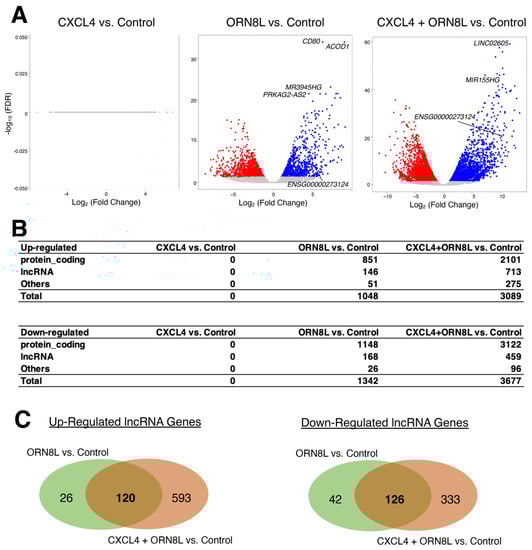 Differentially expressed genes upon treatment with CXCL4, ORN8L, or both. (A) Volcano plots compared to the control, resting cells. n = 3 per condition. (B) Numbers of up- and down-regulated genes for protein-coding, lncRNA, and other genes. Other genes include microRNAs (miRNAs), pseudogenes, ribosomal RNAs (rRNAs), and others based on the categories provided by the Ensembl database. (C) Venn diagrams of up- and down-regulated lncRNA genes comparing ORN8L and CXCL4 + ORN8L compared to the control.
