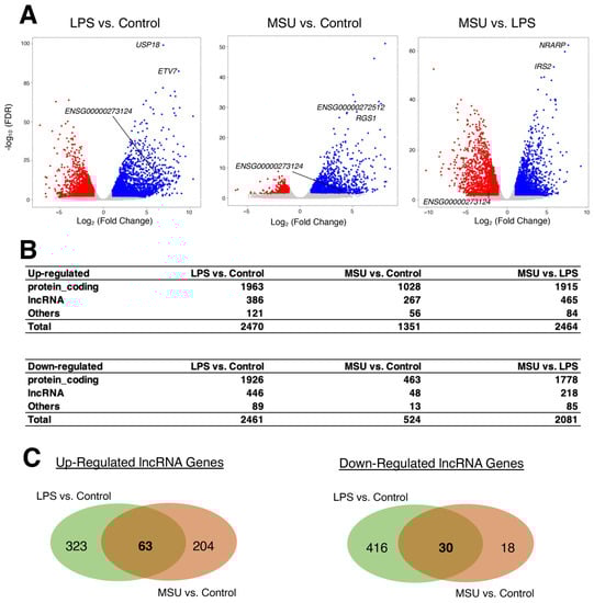 Differentially expressed genes upon treatment with LPS or MSU. (A) Volcano plots of differentially expressed genes in treated cells compared to the PBS control samples. The numbers of samples are 5 for control, 7 for LPS, and 5 for MSU. (B) Numbers of up- and down-regulated genes for protein-coding, lncRNA, and other genes. (C) Venn diagrams of up- and down-regulated lncRNA genes comparing LPS- and MSU-treated samples compared to the control samples.