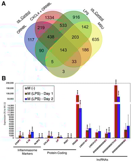 It is evident from the above data analyses that there are many up-regulated genes in both monocytes and macrophages after NLRP3 inflammasome activation; some of which are shared among different conditions (Figure 3A; Supplementary Tables S3 and S4). To date, only a few lncRNAs have been studied in relation to the NLRP3 inflammasome activation in inflammatory cells, especially in macrophages [24,25,26,27,28,29,30,31,32,33,34,35]. To address this point, we selected both protein-coding and lncRNA genes whose expressions were up-regulated in the above-analyzed RNA-seq data (Supplementary Table S5). The protein-coding genes are CASP8 and FADD-like apoptosis regulator (CFLAR), LIF interleukin 6 family cytokine (LIF), the regulator of G protein signaling 1 (RGS1), and radical S-adenosyl methionine domain containing 2 (RSAD2), while lncRNA genes are long intergenic non-protein-coding RNA 1181 (LINC01181), long intergenic non-protein-coding RNA 1215 (LINC01215), novel transcript, antisense to BCAT1 (ENSG00000255921), novel transcript ENSG00000273124, and novel transcript, sense intronic to GBP2 (ENSG00000289582). First, we confirmed their expressions in the human leukemia monocytic cell line, THP-1, treated with phorbol 12-myristate 13-acetate (PMA) to prime these cells into macrophage-like cells (designated as M (-)). Next, to activate the NLRP3 inflammasome, the M (-) cells were induced with lipopolysaccharide (LPS) (designated as M (LPS)) [36]. As shown in Figure 3B, all selected commonly up-regulated protein-coding and three out of five lncRNA genes showed statistically significant up-regulation in M (LPS) compared to M (-) cells as in the case of inflammasome markers (caspase 1 (CASP1), interleukin 1 beta (IL1B), and NLRP3).