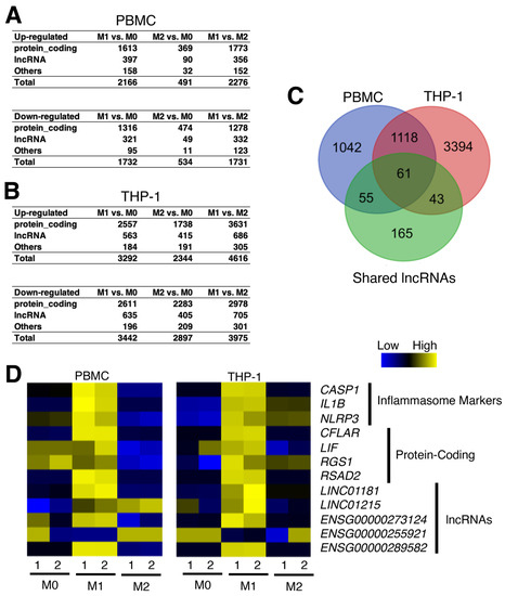Differentially expressed genes upon polarization of naïve (M0) macrophages to pro-inflammatory M1 and anti-inflammatory M2 macrophages. (A,B) Numbers of up- and down-regulated genes for protein-coding, lncRNA, and other genes for (A) PBMC and (B) THP-1 cells (n = 2 per condition). (C) Venn diagram comparing M1 vs. M2 macrophages in PBMC and THP-1 cells to the shared up-regulated lncRNAs from the previous subsections. (D) Heatmap showing marker and candidate genes from Figure 3B.