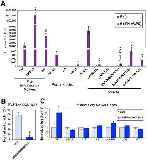 As shown in the previous subsection, our inflammasome-regulated lncRNA genes were highly up-regulated during the polarization of naïve (M0) macrophages to pro-inflammatory M1 macrophages. To further confirm these findings, the expression changes of inflammasome-regulated protein-coding and lncRNA genes were recorded in an in vitro model of pro-inflammatory macrophage activation by stimulating THP-1 cells to macrophage-like cells (M (-); similar to M0 macrophages) and then to pro-inflammatory macrophage-like cells (M (IFN-γ/LPS); similar to M1 macrophages), as described in the Materials and Methods Section. As shown in Figure 5A, all genes (except the protein-coding genes, LIF, and the lncRNA gene, LINC01215) were found to be highly up-regulated in pro-inflammatory M (IFN-γ/LPS) cells compared to M (-) cells.