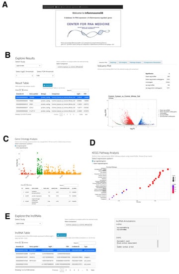 The InflammasomeDB web database. (A) Home page of InflammasomeDB. InflammasomeDB can be accessed freely without the need for username and password. (B) “Explore Results” page. The user-defined threshold values allow the generation of the Result Table and volcano plot. Both the table and volcano plot are generated based on the user-defined threshold values. (C,D) Categorization of the DEGs by enriched (C) GO terms and (D) KEGG pathways for inspecting global changes in signaling pathways. (E) lncRNA page. Detailed information about lncRNA genes is provided as a table along with the information obtained from the LncBook 2.0 database. By selecting a lncRNA of interest in the table, the list of possibly bound miRNAs and the information about GWAS are dynamically generated in the gray box in the right-hand side of the window.