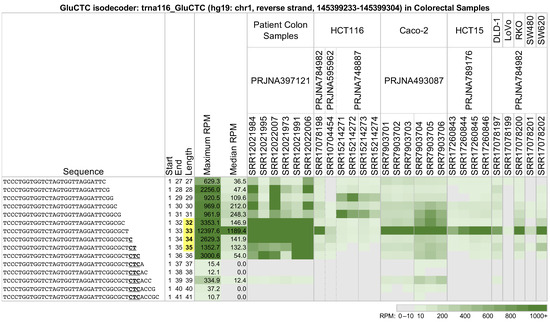 Long 5′-tRFs and 5′-tRHs from the nuclear trna116_GluCTC (hg19: chr1, reverse strand, 145399233-145399304) in colon tissues and model cell lines. In patient colon samples and colorectal cell lines, fragments vary in abundance based on their length and the nature of the biosample. Samples SRR15214273 and SRR15214274 correspond to knockdown of the RAN binding protein 1 (RANBP1). Samples SRR7903704, SRR7903705, and SRR7903706 are RIP-seq experiments using an antibody that recognizes RNAs with methylation of guanosine at position 7 (m7G). The other samples were untreated. tRFs with lengths 32–35 nts are 5′-tRHs (bold, yellow). In the sequence, the anticodon is emphasized (bold, underline). Datasets are identified by their NCBI Sequence Read Archive (SRA) bioproject (second row) and Sequence Read Run (SRR) numbers (third row). Fragments with abundance < 10 reads per million (RPM) were thresholded and are displayed as having an abundance of 0 RPM. Data coloring follows a linear scale up to 1000 RPM.