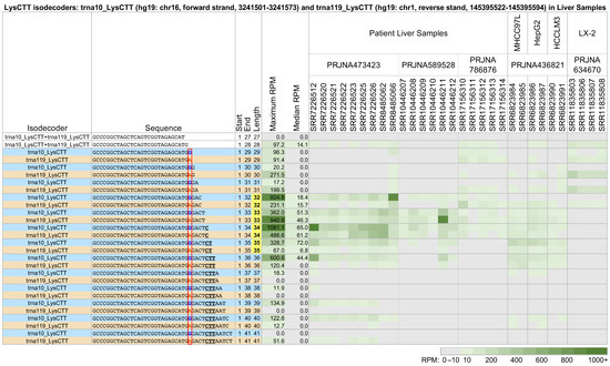 Long 5′-tRFs and 5′-tRHs from the nuclear trna10_LysCTT (hg19: chr16, forward strand, 3241501-3241573) (blue) and the nuclear trna119_LysCTT (hg19: chr1, reverse strand, 145395522-145395594) (orange) in liver tissues and model cell lines. In patient liver samples, the hepatocellular carcinoma cell lines MHCC97L, HepG2, and HCCLM3, and the hepatic stellate cell line LX-2, tRFs vary in abundance depending on their source tRNA, their length, and the nature of the biosample. Samples SRR6823984, SRR6823986, and SRR6823990 were treated with tumor-associated neutrophils (TANs). Samples SRR11835803, SRR11835804, and SRR11835805 were stimulated with TGF-ß1 for 24 h. Samples SRR11835806, SRR11835807, and SRR11835808 were stimulated with TGF-ß1 for 24 h and co-cultured with human umbilical cord mesenchymal stem cells (hUC-MSCs). The other samples were untreated. Differences in tRF sequence are bolded, colored by tRNA isodecoder, and enclosed in a red box. To enable comparisons, all other formatting, highlighting, conditional coloring, and thresholding are exactly as in Figure 2.