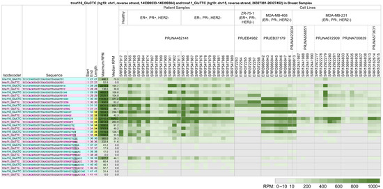 As an example, note the long 5′-tRFs and 5′-tRHs from trna116_GluCTC (see above and Figure 2) and trna11_GluTTC, located on the reverse strand of chromosome 15 between positions 26,327,381 and 26,327,452 (hg19 assembly). While these two tRNAs differ in their Glu anticodon, their nucleotide sequences are very similar. Figure 4 shows a heatmap of the 5′-tRHs and long 5′-tRFs arising from these tRNAs across 59 datasets from eight projects. The datasets correspond to biological samples generated from breast cancer patient samples, the estrogen receptor-positive breast cancer cell line ZR-75-1, and the triple-negative breast cancer cell lines MDA-MB-468 and MDA-MB-231.