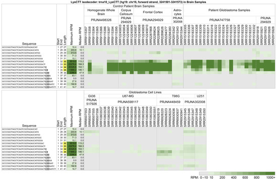 Among the brain samples, the 5′-tRHs of trna10_LysCTT are most abundant in the control samples—projects PRJNA498326 [60] and PRJNA294929 [61]—and the glioblastoma patient samples—projects PRJNA747758 [62] and PRJNA294929. In contrast, the glioblastoma cell line samples from projects PRJNA517926 [63], PRJNA598117 [64,65], PRJNA448459 [66], and PRJNA302008 [67] produce only some of these fragments, if at all, and at a much lower abundance. It is worth noting that in liver patient samples and cell lines, this tRNA produces a more diverse collection of considerably less abundant fragments (see Figure 3).