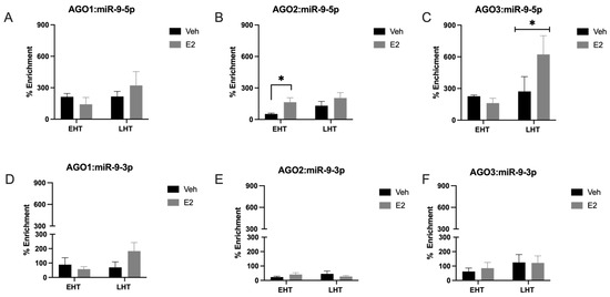 Mammals express four different AGO proteins, of which AGO2 is the most catalytically active, and recent data support the hypothesis that the different AGO proteins have unique cellular functions [11]. Therefore, we tested the hypothesis that E2 induces the differential association of miR-9-5p and miR-9-3p with AGO1, 2, 3, and 4 in the brain. To test this hypothesis, we used RNA Immunoprecipitation (RIP) assays to quantify the association of miR-9-5p and miR-9-3p with AGO1, AGO2, AGO3, and AGO4 in our aged rat model of menopause with early (EHT) or late (LHT) hormone replacement therapy following ovariectomy (OVX). The association of miR-9-5p and miR-9-3p with each AGO protein was quantified using whole cell lysate dissected from the paraventricular nucleus (PVN) of the hypothalamus. Our results demonstrated that both miR-9-5p and miR-9-3p were associated with AGO1, AGO2, and AGO3, but not with AGO4 (Figure 1; AGO4 not shown). In fact, AGO4 was undetectable in both vehicle and E2-treated rats, which is consistent with other studies showing little to no expression of AGO4 in all central nervous system (CNS) cell types [12]. Overall, AGO2 had the lowest percent enrichment of miR-9-5p and miR-9-3p compared to AGO1 and AGO3 (Figure 1A–C), perhaps indicating different kinetics of miRNA turnover between the different AGO proteins. Treatment with E2 significantly increased miR-9-5p association with AGO2 in animals treated early after OVX (EHT), but not in animals treated late (LHT, i.e., prolonged E2 deprivation (Figure 1B). Moreover, E2 treatment significantly increased miR-9-5p association with AGO3 in the LHT group, but not in the EHT group (Figure 1C). There were no effects of E2 treatment in miR-9-5p association with AGO1, or in miR-9-3p association with AGO1, AGO2, or AGO3 in either group (Figure 1D–F). Overall, our results demonstrated that miR-9-5p was preferentially loaded onto AGO3 (Figure 1C). For example, miR-9-5p was loaded onto AGO3 at almost double the capacity of AGO2, while AGO2 enrichment was lowest overall.