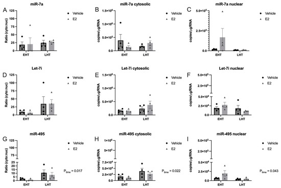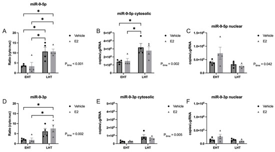 This subcellular shift was further supported by a statistically significant increase in the cytosolic:nuclear ratio observed in the LHT group (Figure 2A). However, E2 treatment had no additional effect on the amount of miR-9-5p in either subcellular compartment regardless of the length of time post-OVX (Figure 2A–C). Our data also revealed a statistically significant main effect of time on E2 deprivation in the amount of cytosolic miR-9-3p, but not in the nucleus (Figure 2D–F), which was verified by a significant increase in the cytosolic:nuclear ratio in the LHT group (Figure 2D).