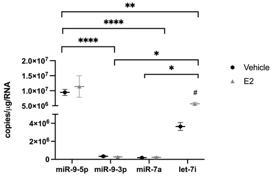 Comparison of absolute expression levels for E2-regulated miRNAs in the hypothalamic-derived neuronal cell line, IVB. Absolute levels of miR-9-5p, miR-9-3p, miR-7a, and let-7i were quantified by RT-qPCR from cells treated with E2 for 16 h prior to lysis and RNA isolation. Data are depicted as mean ± SEM and analyzed by one-factor ANOVA. * p < 0.05; ** p < 0.01; **** p < 0.0001.