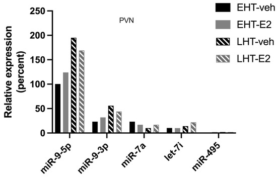Comparison of relative expression levels for E2-regulated miRNAs in the paraventricular nucleus of the hypothalamus in aged female rats. The paraventricular nucleus of the hypothalamus was microdissected from aged rats treated with 17β-estradiol (E2) or safflower oil (Veh) at 1 week (early hormone treatment, EHT) or 4 weeks (late hormone treatment, LHT) post ovariectomy. Relative levels of miR-9-5p, miR-9-3p, miR-7a, let-7i, and miR-495 were quantified by RT-qPCR. Data are depicted as percent difference compared to miR-9-5p (early vehicle treatment).