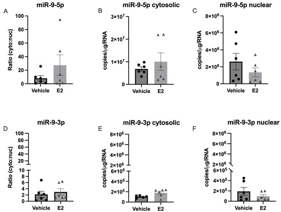 Next, we quantified nuclear and cytosolic levels of each miR and tested if E2 treatment altered the cytosolic:nuclear ratio. In contrast to what we observed in our aged rat model of menopause, there was no significant change in the cytosolic:nuclear ratio of miR-9-5p or miR-9-3p in IVB cells treated with E2 (Figure 6).