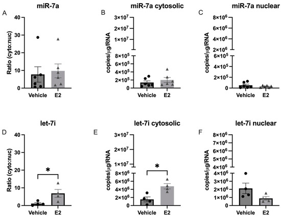E2 treatment altered subcellular localization of let-7i, but not miR-7a in hypothalamic-derived IVB cells. Cells were treated with E2 for 16 h prior to lysis, cellular fractionation, and RNA isolation. Fractions were processed for RT-qPCR and absolute levels of miR-7a (A–C), and let-7i (D–F) were quantified based on extrapolation from a known standard curve. Data are depicted as mean ± SEM and analyzed by one-factor ANOVA. An * indicates p < 0.05.