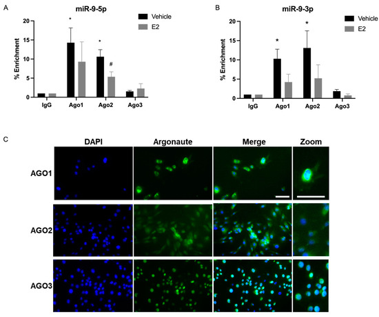 E2 shifted miR-9-5p and miR-9-3p association with argonaute proteins in the nucleus of hypothalamic-derived IVB cells. Nuclear fractions of cell lysates were processed for RNA immunoprecipitation of miR-9-5p (A) or miR-9-3p (B) association with AGO1, AGO2, or AGO3. Data are depicted as mean ± SEM and analyzed by two-factor ANOVA. An * indicates p < 0.05 between groups; # indicates p < 0.05 within groups. (C) Immunofluorescence for AGO1, AGO2, and AGO3 in IVB cells. Green = AGO proteins; blue = DAPI. Scale bar = 50µm.