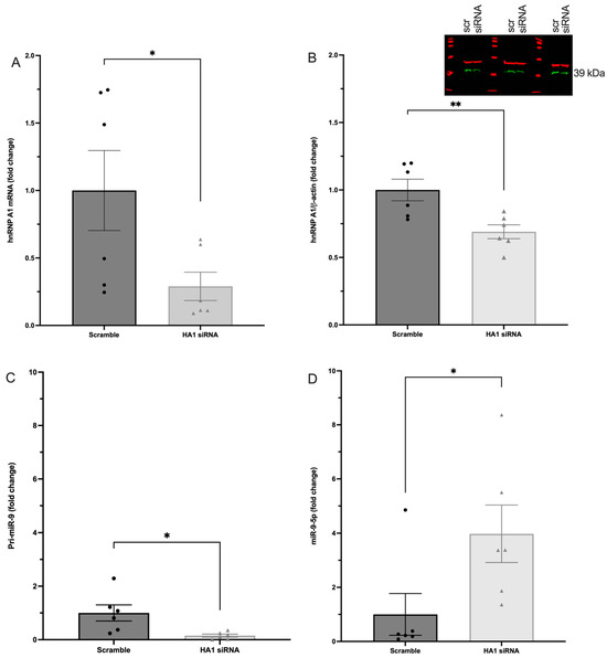 Our previous work showed that miR-9-5p and miR-9-3p were regulated by E2 in an age-dependent manner [6,9], and that miR-9-5p was overall less stable than miR-9-3p [10]. Further, we used a proximity-dependent biotinylation approach combined with mass spectrometry to identify RNA binding proteins associated with miR-9-5p and miR-9-3p to determine possible mechanisms for the observed differences in stability of miR-9-5p/3p in neurons [8]. One of the main RBPs associated with miR-9-5p, but not miR-9-3p, was hnRNP A1, and we hypothesized that hnRNP A1 binding helped to stabilize mature miR-9-5p in the cytoplasm. To test this hypothesis, we used siRNA to knockdown hnRNP A1 in IVB cells and then measured miR-9-5p expression with RT-qPCR.