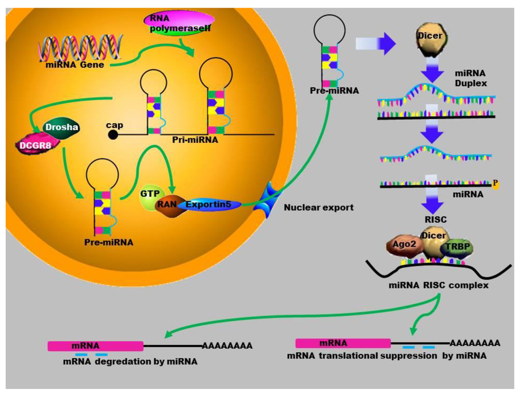 Schematic outline of the biogenesis of miRNA: MiRNA is transcribed by RNA polymerase II to form a primary microRNA molecule. These Pri-mRNA molecules are large RNA precursors and are comprised of a 5ʹ-cap and poly-A tail. This is then cleaved by the Drosha complex to generate pre-miRNA that is exported to the cytoplasm by Exportin-5, where it is processed by Dicer into a miRNA duplex. The guide strand (mature miRNA) is then incorporated into the miRISC where gene silencing can be accomplished via mRNA target cleavage (degradation), or through the prevention of translation.